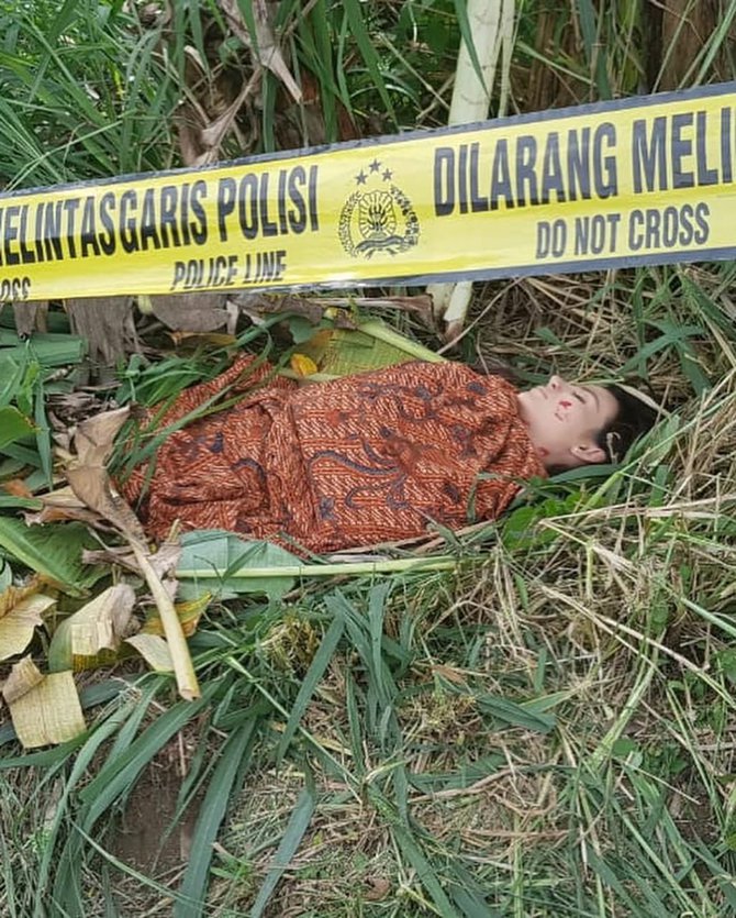 Dalam foto terlihat, mayat wanita tergeletak di semak-semak dan sebagian tubuhnya tertutup daun pisang.